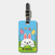 Adorable white cartoon bunny rabbit poking his head out of his bunny hole. he is surrounded by green grass and lots of pretty colourful flowers. Above his head are two bright butterflies fluttering about in the clear blue spring sky. Templates on the front and back to add your name and details.