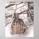 This fine art photography poster features a typical winter scene: a sweet brown cottontail bunny rabbit with big ears is huddled under a pine tree seeking shelter from the snow storm.