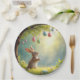A curious bunny sits under a tree adorned with colourful, hanging Easter eggs, enjoying the serene morning light.