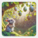 A curious bunny gazes up at beautifully decorated eggs hanging from the branches of a lush, green tree