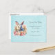 Save the date postcard with a watercolor image. A white gray bunny rabbit surrounded by a garland of pink and peach roses. For bunny lovers and Easter themes and birthdays and showers.