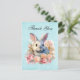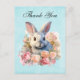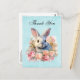 Thank you postcard with a watercolor image. A white grey bunny rabbit surrounded by a garland of pink and peach roses. For bunny lovers and Easter themes and birthdays and showers.