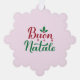 Front: Cute Italian Merry Christmas/Buon tree ornament in red and green on white in a beautiful pewter metal snowflake frame.