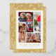Buon Natale Photo Collage Gold Winter Snowflake Foil Holiday Card Foil Stamped Christmas Cards features a photo collage of five of your favourite photos with the foil text overlay "Buon Natale" in modern calligraphy script typography on a background of snowflakes on a golden background. Personalised your names or custom text below. Perfect for family and friends to celebrate Christmas and the holidays. Designed by ©2025 Evco Studio www.zazzle.com/store/evcostudio