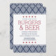 Our summery invitations are perfect for your casual wedding rehearsal dinner! Design features a classic colour palette of red, white and blue, with a diamond chevron patterned background, red star accents, and modern lettering in navy blue and rich dark red. All text fields are fully customisable, making it easy for you to add your party details and change the holiday, occasion or event type.