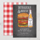Modern and fun chalkboard burgers & brew barbecue adult birthday party invitation featuring a bottle of beer with a huge hamburgers set on a black chalkboard background & a matching red chequered cloth back for a special touch .