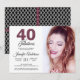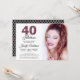 A chic, elegant, 40th birthday photo invitation you can personalise and send out for your fortieth birthday party celebration. The words "40 and Fabulous" in burgundy glitter and black are set using modern typography. Simply add your own personal details and your own photo. There's a black and white diamond pattern on the back of the card with burgundy glitter ribbons. If you need any help or matching products, please contact us through our store.