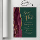 This elegant modern save the date magnet card features a burgundy watercolor agate border trimmed with faux gold glitter. Easily customise the gold-coloured text on an emerald green background.