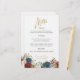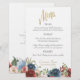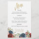 Beautiful watercolor floral in shades of blues, burgundy and blush, dinner menu with gold text accents to compliment our wedding invitation set.