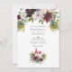 Trendy bordo - marsala and navy blue wine-themed peafowl wedding invitation with accents of dusty blue, blush pink, plum and rose gold with wild woodland forest eucalyptus greenery. Ideal for any given theme or garden wedding. The QR code on the reverse directs to your wedding site where people can learn more and rsvp.