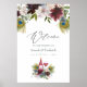 Trendy bordo - marsala and navy blue wine themed peafowl wedding welcome poster with accents of dusty blue, blush pink, plum and rose gold with wild woodland forest eucalyptus greenery.