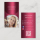 A burgundy arch background. Personalise and add your photo, name, title and contact information. Add your website url/link to the Qr code. With Facebook and Instagram icons. White text.