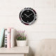 Modern clock features an artistic abstract design in a burgundy, black and white colour palette. A simple design with white numbers on a black background with an burgundy wine coloured border featuring artistic abstract design elements.