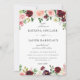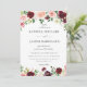 Elegant watercolor burgundy red, blush pink, peach and white floral arrangements, wedding invitation. Card features elegant and modern typography design. Burgundy red solid colour backing.