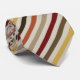 This neck tie features even diagonal stripes in burgundy, brown, mustard, rust and tan on a beige background.