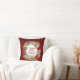 Modern, decorative BURGUNDY Christmas wreath THROW PILLOW with the message CELEBRATE JESUS EMMANUEL GOD WITH US at the centre. This text is customisable so you can replace with your own message or name. In the background, there is a subtle tiled message which says SEASON'S GREETINGS. Other Christmas pillows are available in the CHRISTMAS Collections by Berean Designs.