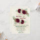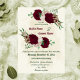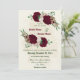 Beautiful romantic wedding invitations featuring burgundy and champagne flowers and some green leaves .