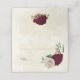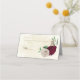 Beautiful romantic wedding place card featuring burgundy and champagne flowers and some green leaves .