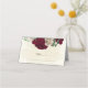 Beautiful romantic wedding place card featuring burgundy and champagne flowers and some green leaves .
