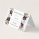 Folded tent cards to use for Wedding Reception Seating placecards. You will fill out the name or names and the table number on each card. Elegant burgundy, blue and pink watercolor floral and foliage design continues on the reverse side with an additional message for your guests. Designed by Audrey Jeanne Roberts.