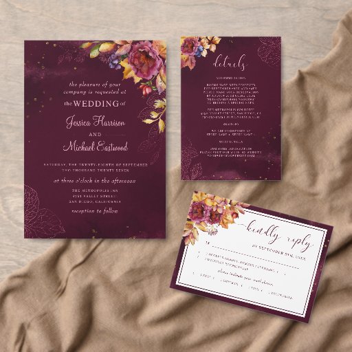 Watercolor Fall Floral Burgundy Rose Gold WeddingDesigned by Witty Betty
