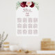 Easily help your guests find their seat with this poster wedding seating chart, featuring a watercolor burgundy and blush floral bouquet with eucalyptus greenery at the top, and a modern script monogram with ampersand and the names of the bride and groom.