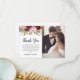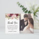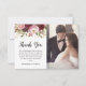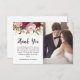 Elegant watercolor wedding thank you note on a flat invitation card is a simple way to thank those who attended your wedding day. The card features a photo for you to change to your own, an array of marsala red, burgundy & blush pink watercolor floral flowers, a gold glitter, and a thank you note.