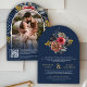 Burgundy Floral Roses QR Code Photo Navy Wedding Invitation