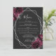 This elegant modern wedding menu features a silver geometric frame decorated with burgundy and silver floral bouquets on a black background. The customisable text combines silver grey whimsical handwriting, copperplate and italic fonts. The reverse side is solid black.