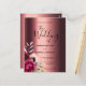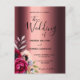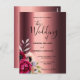 On front: A modern and elegant wedding invitation. A faux copper metallic looking background. Decorated with dark purple and burgundy and rose pink Flowers. Templates for names, date and place of the wedding. The text: The Wedding of is written with a large hand lettered style script, black coloured letters.