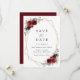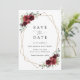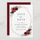 Invite friends and family in style and set the tone for your special day with this charming save the date card. Design features burgundy watercolor flowers, greenery and gold frame on white background.
