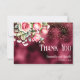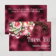 An elegant wedding thank you card featuring pink roses on a faux burgundy foil and gold glitter background.