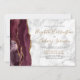 The left-hand edge of this elegant modern wedding invitation features a burgundy watercolor agate border trimmed with faux gold glitter. The customisable text combines black and gold-coloured handwriting, copperplate and italic fonts on a grey and white marble background. The grey and white marble pattern is repeated on the back of the card.