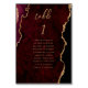This elegant modern wedding table number card features a burgundy watercolor agate background trimmed with faux gold glitter. The word "table" appears in gold-coloured handwriting script. Add the names of your guests who are assigned to each table.