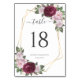 Elegant burgundy and blush floral wedding table numbers featuring a gold geometric frame surrounded by red and blush roses with greenery. Matching items available.