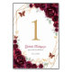 Burgundy gold and white Quinceanera celebration table number cards. Features, script font, gold butterflies, watercolor roses and tiara. Perfect for an elegant princess style glam celebration. Personalize with your own details. Printed Zazzle invitations or instant download digital printable template.
