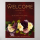 Elegant and classy wedding sign poster with custom faux gold copper script lettering on a dark red burgundy antique distressed velvet like background featuring a beautiful winter botanical bouquet with purple plum, indigo, lilac and ivory cream flowers +++++++++++++ Suitable for glamourous elegant Christmas / winter seasonal weddings.