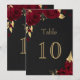 burgundy flowers with some gold leaves gold black table number card