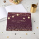 Beautiful, elegant burgundy and gold wedding guestbook with string lights and lanterns and glitter. Customisable text has the couple's names and wedding date. Contact us for help with customisation or matching products.