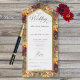 AVAILABLE WITH OR WITHOUT A QR CODE OR DINNER SELECTION OPTIONS. This design features a beautiful marsala burgundy wine and yellow gold rustic floral pattern on a green aged background. The text is displayed on a white text area insert with a faux gold frame. The back continues the floral pattern and includes the bride and groom's first initial. Created by Simply Farmhouse Press.