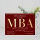 A MBA graduation party invitation with gold foil, white text, and a burgundy background. Simply add your information, add this invitation to your cart, and celebrate this major accomplishment.