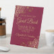 This beautiful wedding tabletop guest book sign is a wonderful welcome for your guests, and will help you direct them to sign your guest book to leave a lasting memory of your special day. It features a simple yet elegant burgundy red and gold design with script lettering and lacy golden faux foil curls and swirls in the corners. The sign reads: Please Sign Our Guestbook. Thank You for Celebrating with us! There is room for your names and the wedding date below.
