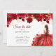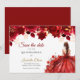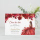 Announce your special day in style with this elegant Quinceañera Save the Date card. Featuring a stunning design of deep red roses, golden accents, and a beautiful illustration of a young woman in a flowing red ball gown with a crown, this card captures the magic of a princess-like celebration. A timeless and romantic way to let guests know to mark their calendars for your unforgettable Quinceañera.