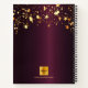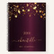 A dark burgundy faux metallic looking background, decorated with faux gold dripping stars. Template for a year 2021. Personalise and add a name and a title. The name is written with a golden modern hand lettered style script with swashes.