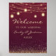 Wedding welcome banner / sign with rustic elegant string lights and lanterns on a burgundy background with glittery gold. This sign matches our Burgundy Gold Glitter String Lights Wedding Collection. Contact us for help with customisation or to request matching products.