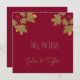 Square invitation card with golden maple leaves in burgundy background . It comes with text " Fall in Love " Stylish invitation/announcement for your wedding in autumn/fall .Both sides to be customised ! Template design by Alma Wad .