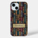 This iPhone and Samsung cell phone cover features an image of antique books, stacked on another, in hues of burgundy, teal, green, purple, and brown, with gold trim. Your name or initials appear in bookish type on a gold background. Make sure to type it into the Personalise section.