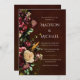 Beautiful bouquet of burgundy & cream flowers mixed with greens bordering modern fonts done in white on a deep elegant burgundy background were used to create this modern wedding invitation. Perfect for any season wedding. Coordinating burgundy on reverse side. Absolutely stunning!