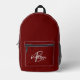 This personalised backpack features a monogram and first name in modern grey and white script on a stylish burgundy red background.