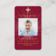A burgundy background, a Space for your photo. A golden cross. Light beams, behind the photo. Personalise and add name, dates and your text and prayer.